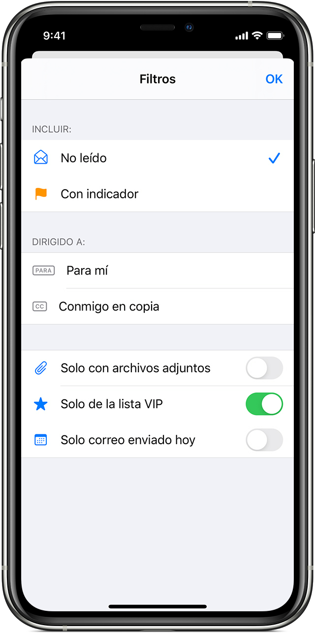 Usa los filtros para buscar los correos electrónicos que desees leer y para ocultar los demás mensajes. Puedes filtrar los mensajes de correo electrónico según diferentes criterios, como mensajes no leídos, con indicador, mensajes enviados a ti, mensajes de contactos VIP y más. Sigue estos pasos para hacerlo: