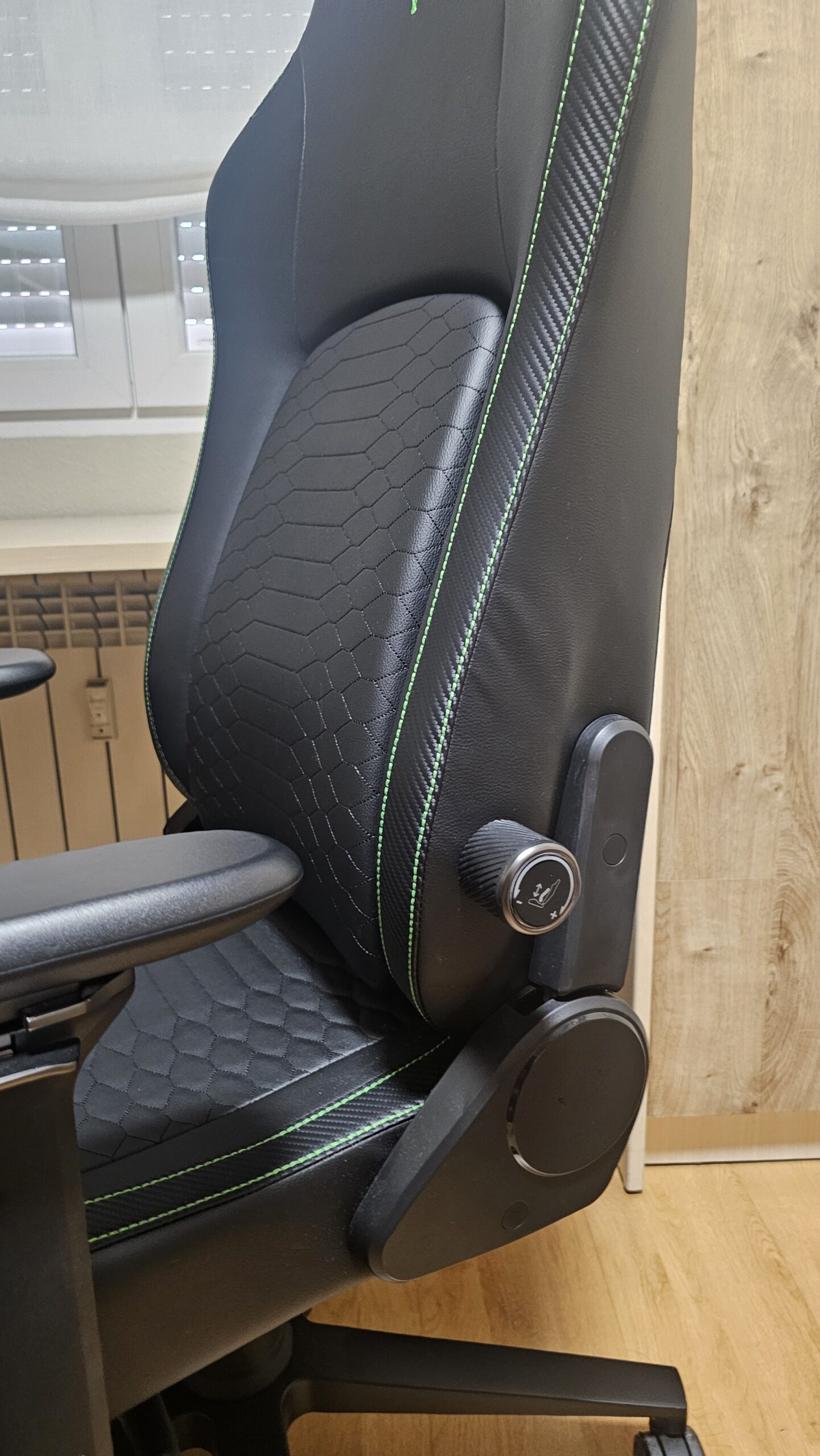 Los detalles en acento verde en los costados, el respaldo y los bordes de los reposabrazos proporcionan ese toque distintivo que caracteriza a todos los productos de Razer. Además, el logo de la marca en el respaldo agrega un toque de elegancia y modernidad que no pasa desapercibido en cualquier ambiente de juego o oficina.