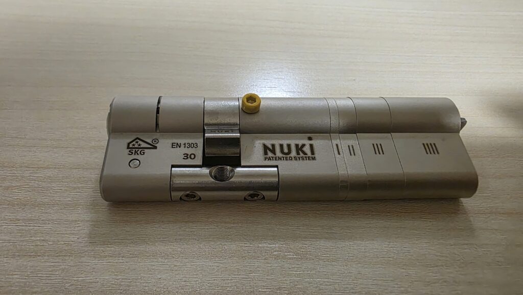 A primera vista, el Nuki Smart Lock Ultra mantiene la línea estética de sus predecesores, con una forma característica que combina un cilindro motorizado sin escobillas en la parte inferior y un anillo giratorio manual en la superior. Sin embargo, los materiales han sido actualizados para transmitir una mayor sensación de calidad. El cuerpo principal está fabricado en aluminio cepillado, disponible en acabados blanco y negro (el anillo), lo que le confiere un aspecto más premium y robusto que el plástico de generaciones anteriores. Las dimensiones se han optimizado ligeramente, resultando en un dispositivo algo más compacto y discreto. El anillo sigue siendo de aluminio y cuenta con un LED que se ilumina para indicar el estado de la cerradura, una seña de identidad de la marca que se mantiene por su utilidad y atractivo visual. Además el modelo ultra tiene para mi la parte diferecian que viene con un cilindro de seguridad adaptable por tamano a cuualquier puerta blindada y no te hace tener que cambiar la cerradura.