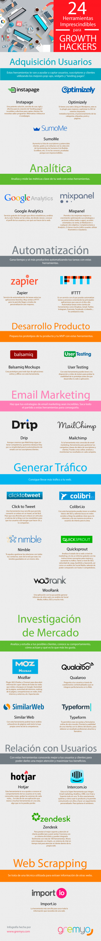 Una infografía con 24 Herramientas para Growth Hackers. Vía gremyo
