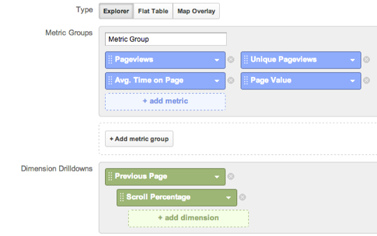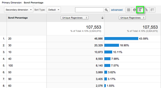 - Usted debe también echa un vistazo a gran post de Justin Cutroni en la medición de seguimiento de desplazamiento / contenidos en la página . Esta es una técnica valiosa, pero diferente del scroll. Justin lo desarrollo lanzando eventos cuando un usuario llega a una zona de la página. Mide el porcentaje máximo de desplazamiento de ese usuario y para una página específica . Esto conduce a la más simple, la presentación de informes más procesable.