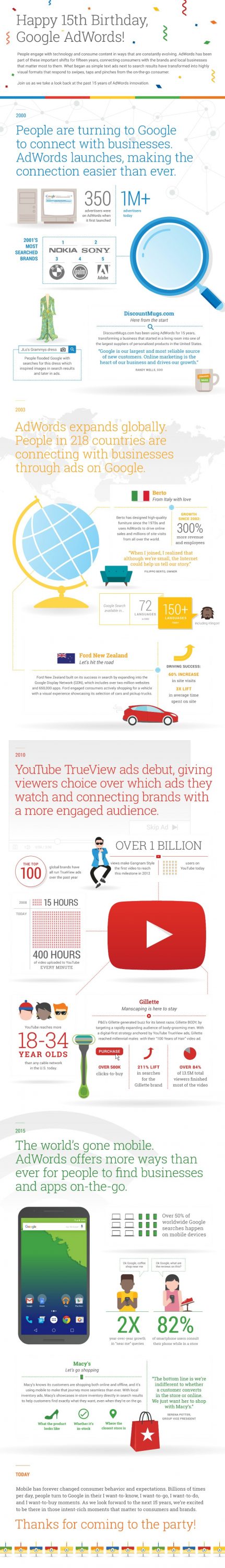 Adwords cumple 15 años conectando a empresas de todo tipo con sus consumidores a través de Internet. A lo largo de estos 15 años, AdWords se ha ido transformando con nuevos formatos y capacidades, adaptándose las tendencias de un mundo cambiante, hoy centradas en la movilidad y el consumo a través del smartphone. A día de hoy, AdWords está disponible en 218 países y más de un millón de anunciantes lo utilizan.