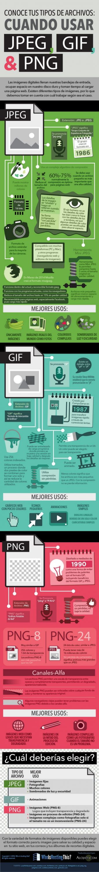 Las fotografías son uno de los contenidos más atractivos en Internet. Cuando usar jpeg, gif o png. Infografía. Una la mala elección de los tipos de archivos de imágenes PNG, JPEG o GIF suele ser la principal causa de que muchos blog y/o páginas webs tarden demasiado en cargar JPEG, GIF, PNG… ¿Qué formato de imagen escoger para el web ?