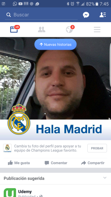 Para modificar la foto de perfil, si no aparece la opción en el muro, se debe identificar entre los contactos a alguno que ya haya cambiado su imagen. Desde el móvil si ves que un amigo se ha cambiado su foto de perfil añadiendo una marca. Te saldrá un botón para cambiar el tuyo. Eso ha pasado por ejemplo con los atentados de París y ahora por la red social se hace viral poner el escudo de tu equipo para la final de Champions. Después de elegir el equipo, te saldrá la cámara para hacer un Selfie y si te gusta lo guardaras como foto de perfil de Facebook.