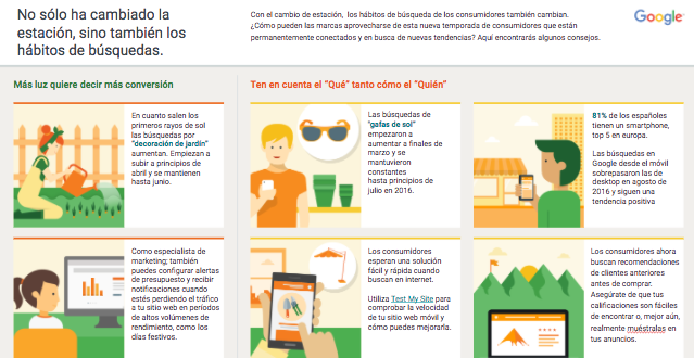 Google: los intereses de los consumidores cambian con la primavera. El buscador ha analizado cómo los hábitos de búsqueda de los consumidores cambian con el cambio de estación, literalmente, de un día para otro. De repente hay menos búsquedas sobre productos relacionados con el invierno como botas de agua, abrigos, etc., para dar paso a búsquedas más relacionadas con la primavera. Así, productos como barbacoas, rutas en bicicleta, muebles de jardín o plantas de exterior empiezan a liderar el ránking de búsquedas en internet.