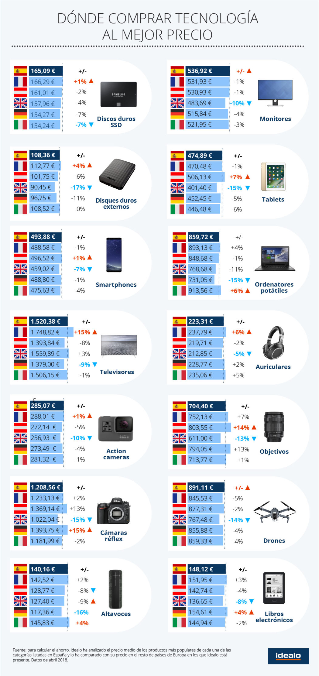 Curiosamente, Reino Unido se descubre como uno de los países europeos más baratos para los españoles en los que comprar dispositivos tecnológicos. Adquirir tecnología en las Islas Británicas nos permite ahorrar hasta un 9,6 % de media, frente al precio del mismo producto en una tienda online española. Este ahorro puede llegar a ser de hasta un 17 % en el caso de los discos duros externos, o de un 15 % si vamos a comprar cámaras réflex o tablets. A pesar de ello, a la hora de hacer compras en otros países de Europa, los españoles sobre todo preferimos comprar en tiendas alemanas, austríacas e irlandesas.