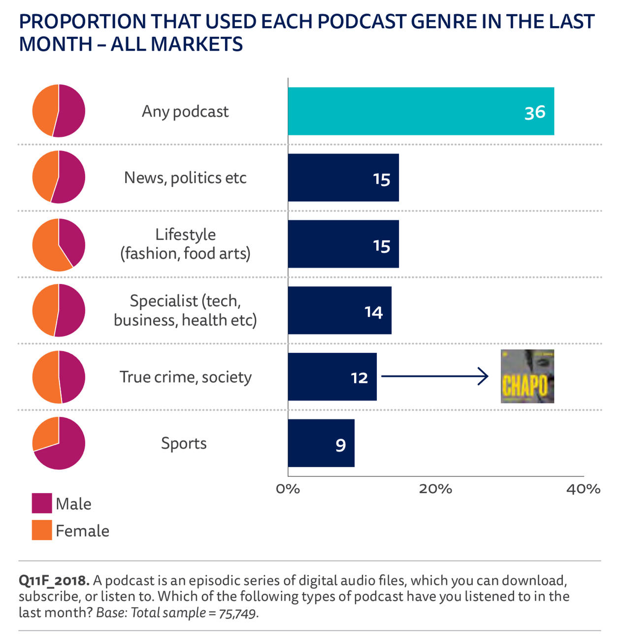 Estudio sobre Internet en España. The Digital News Report 2019. La escucha de podcast llega al 39%. Ha llegado el informe ‘The Digital News Report 2019’, el informe elaborado por Reuters Institute con más de 75.000 encuestas en 38 países. USA y Suecia son los países de mayor consumo en menores de 35 años. En Reino Unido el 55% de las escuchas se hacen en smartphone. Los podcast se consumen principalmente en casa y con una duración de entre 20 y 40 minutos.