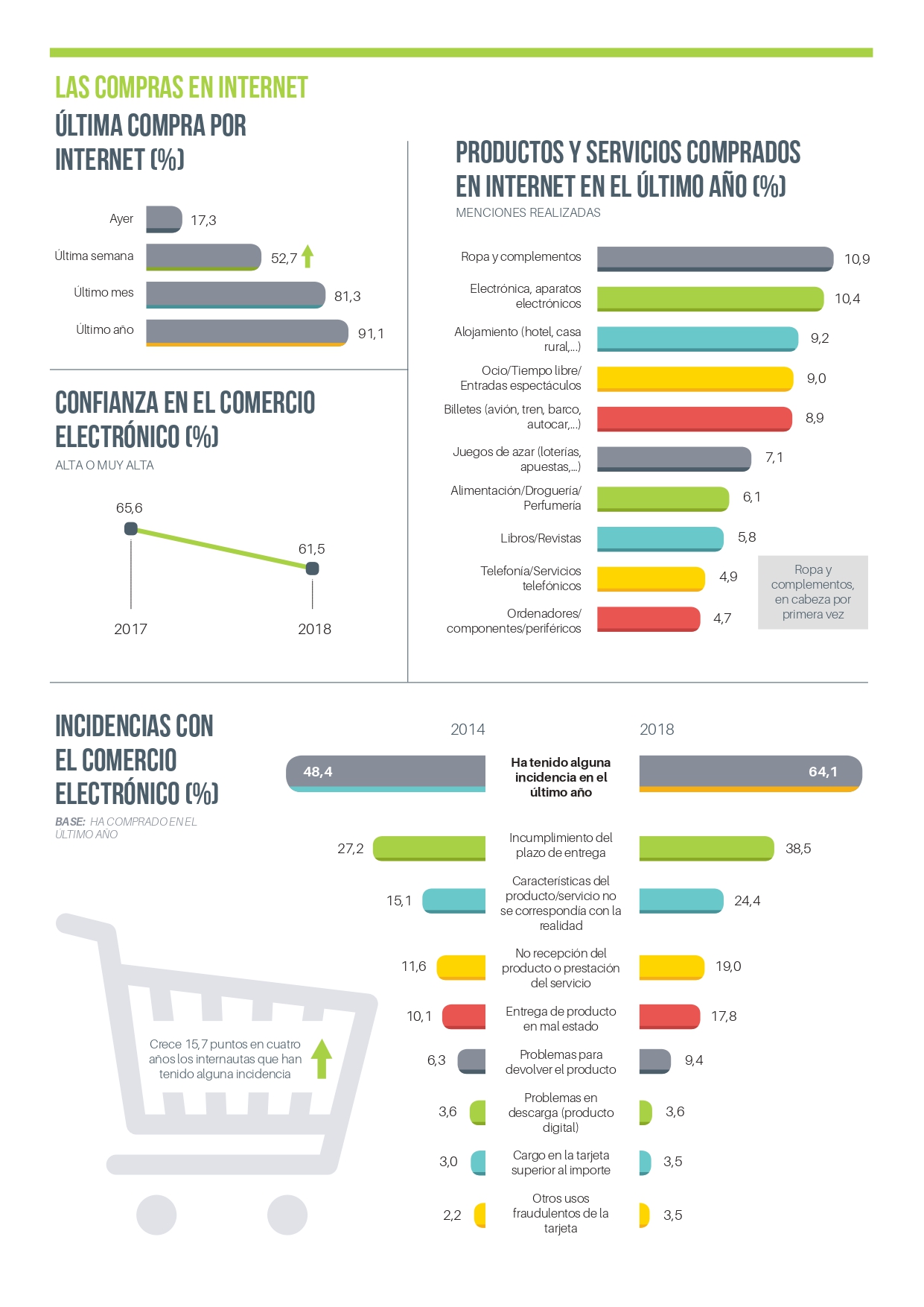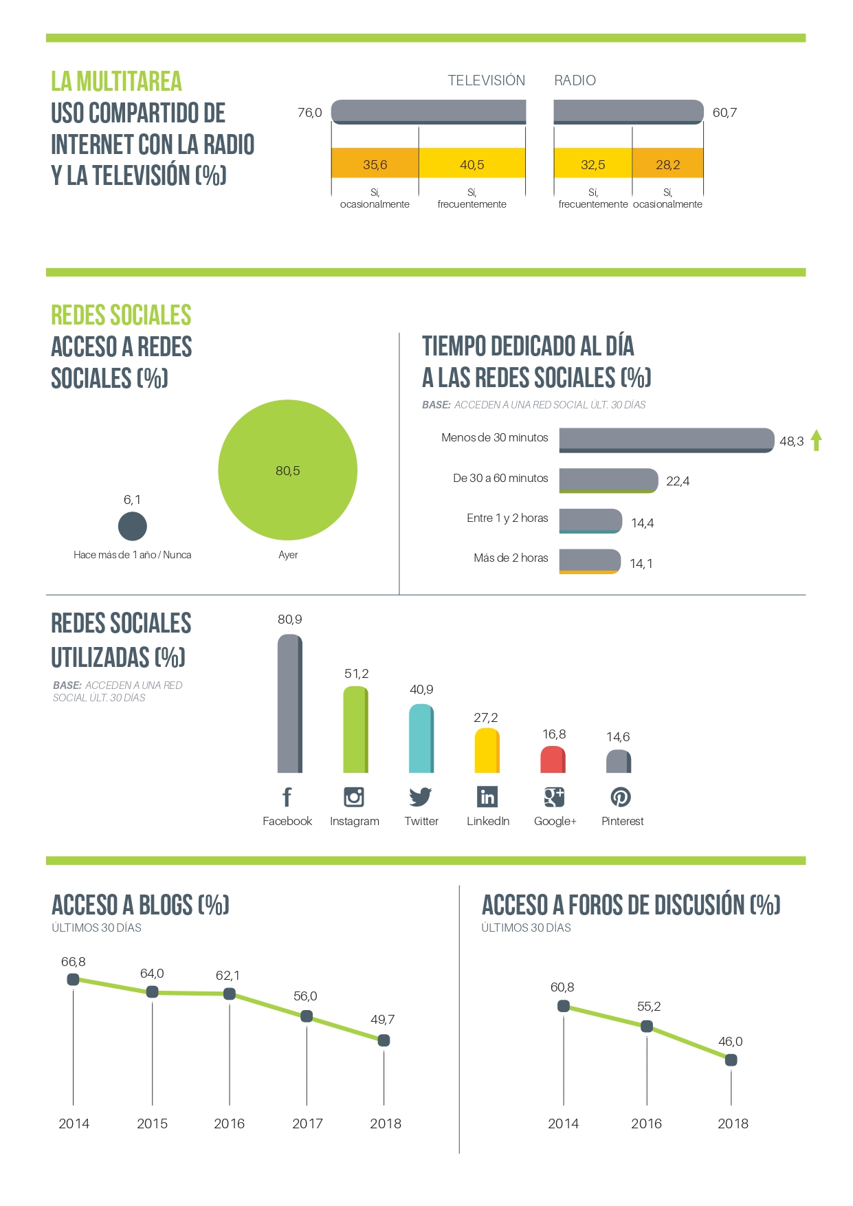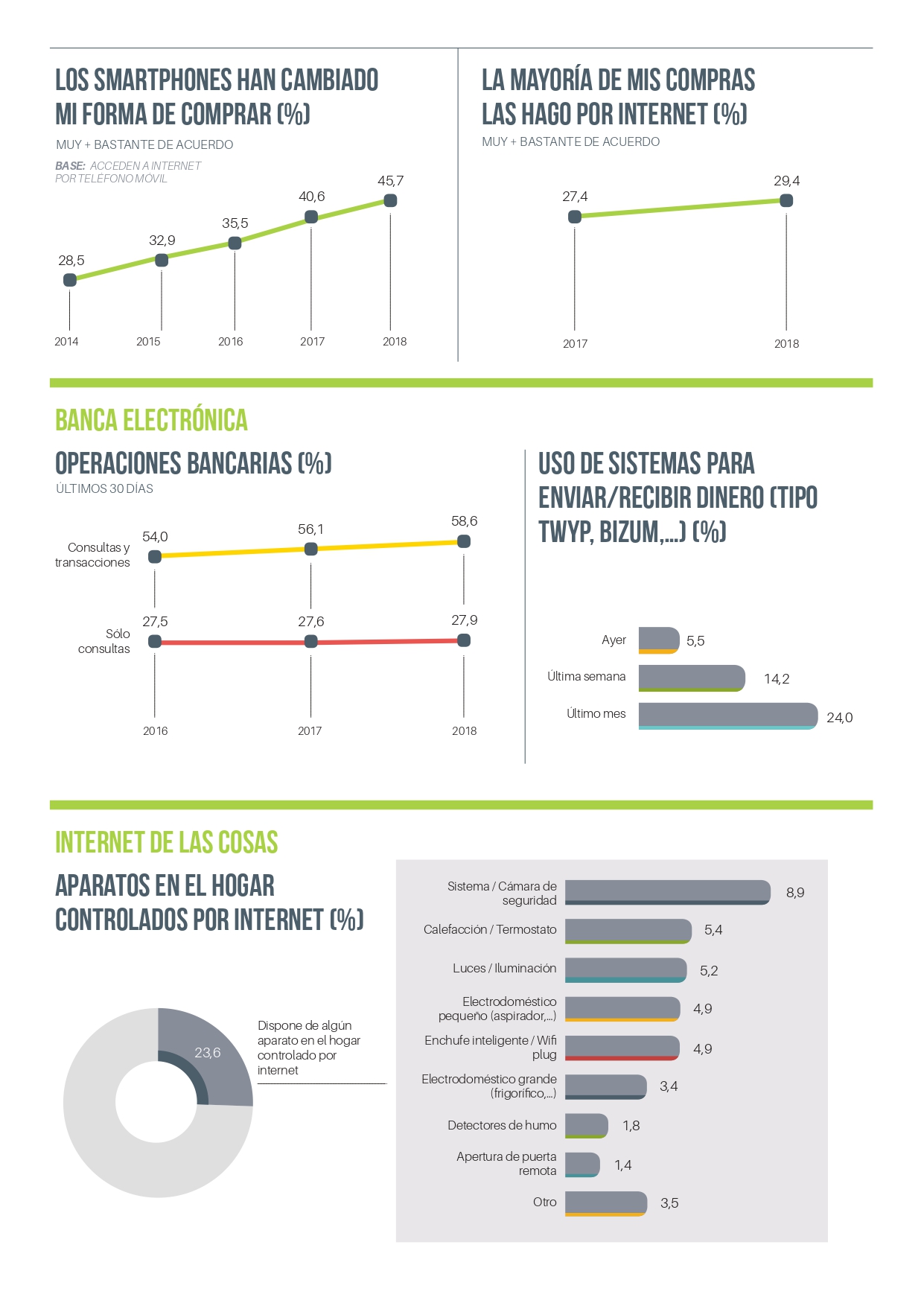 Las actividades que más llevan a cabo los navegantes cuando se conectan a internet desde su móvil son: usar el correo electrónico (84,9% de los que se acceden a internet por el móvil lo ha realizado en los últimos 30 días); utilizar los servicios de mensajería instantánea (78,4%); la navegación, en general (76,1%); el uso de redes sociales (69,7%); lectura de noticias de actualidad (65,3%); las consultas o transacciones bancarias (62,6%,+10 puntos en tres años); la visualización de vídeos (60,8%); subir fotos (44,4%); compras (43,0%, +14 puntos en tres años); escuchar música online (41,7%); escucha de radio por internet (27,0%) y subir vídeos (21,2%).