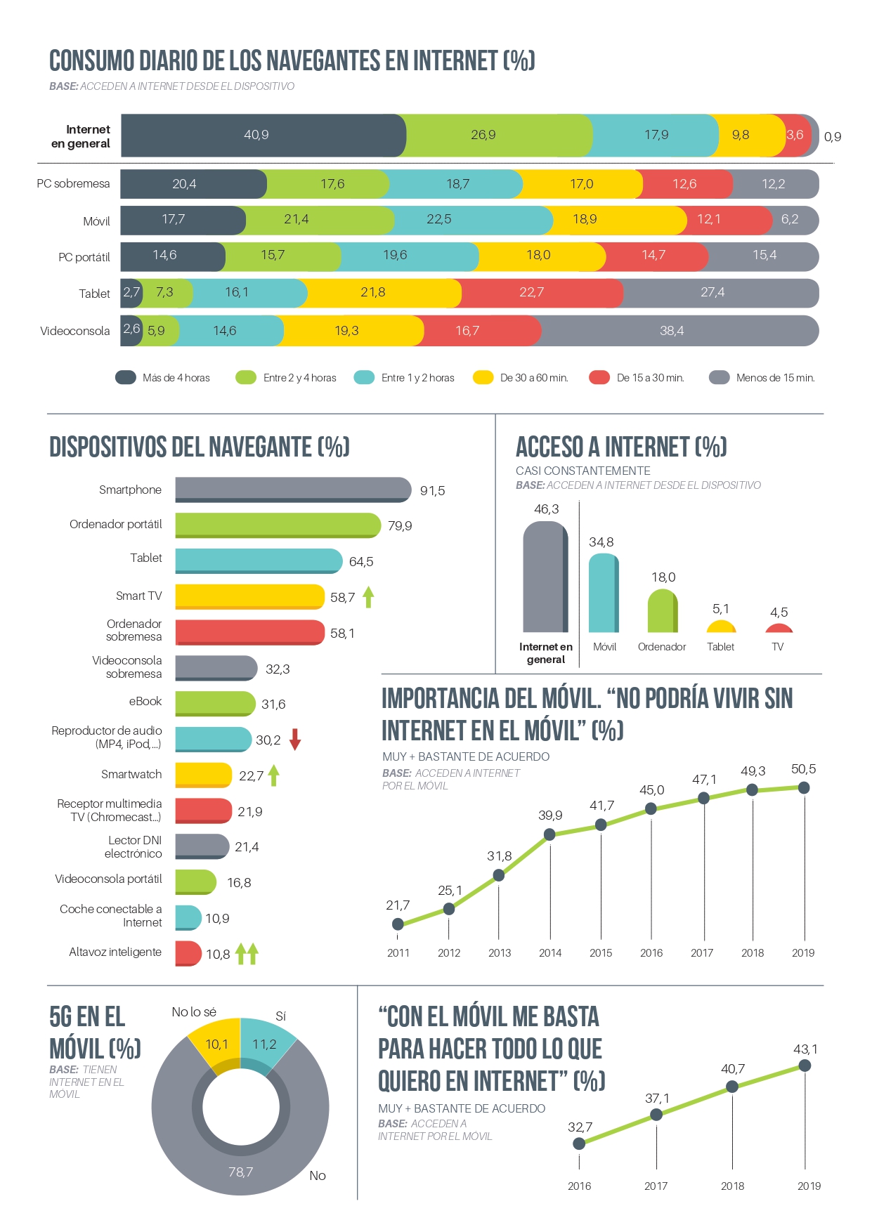 mitad de los entrevistados (50,5%) consideran que “no podrían vivir sin internet en el móvil” (+11 puntos en cinco años) frente a aquellos que están en desacuerdo con esta opinión (22,9%, -10 puntos en cinco años).
