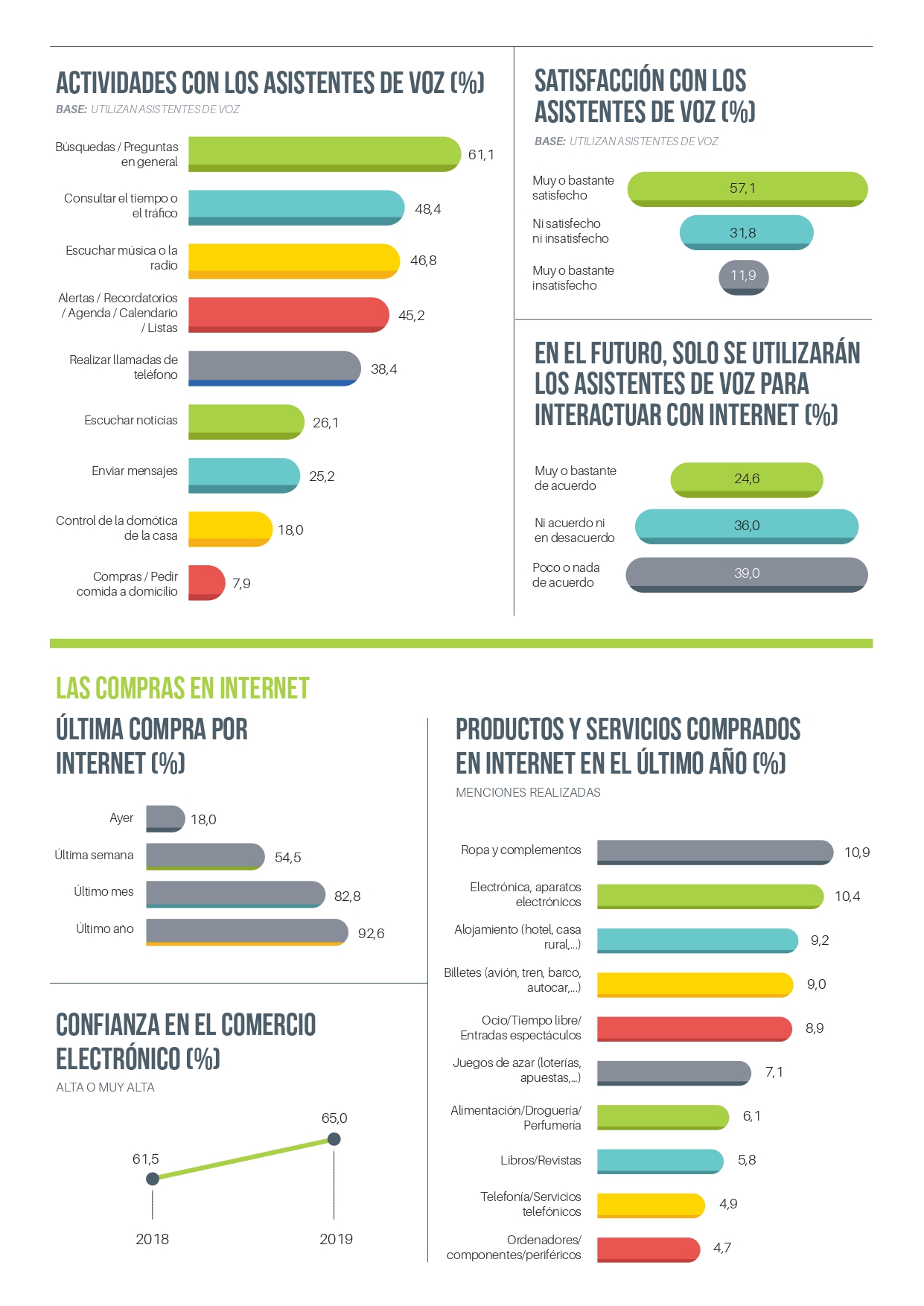 En cuanto al ránking de asistentes más utilizados, encabeza la lista el Asistente de Google, utilizado por el 53,1%; Siri (Apple), con un 37,1%; Alexa (Amazon), con un 22,9% y Cortana (Microsoft), escogido por el 10,6%.