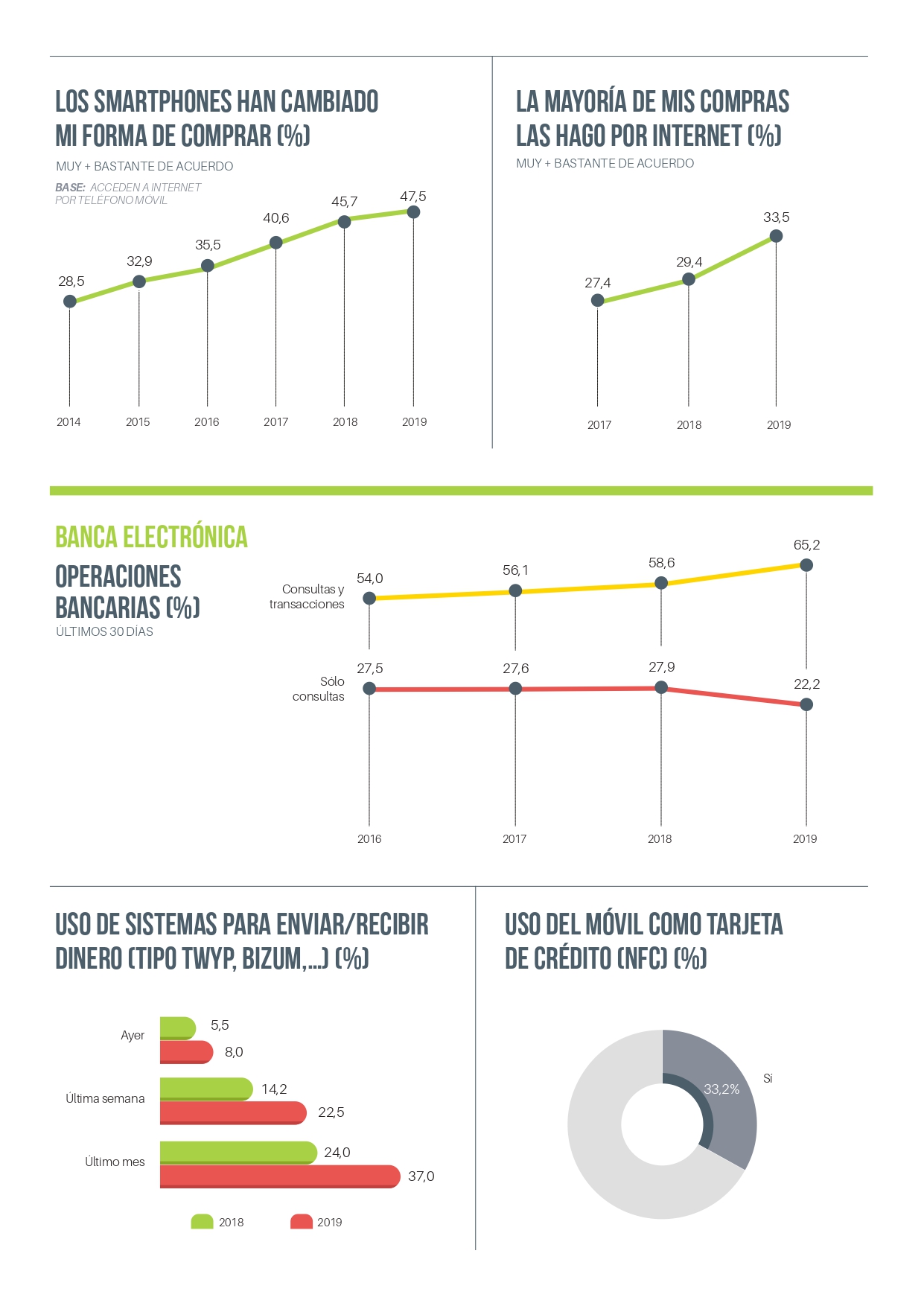 El uso del móvil como tarjeta de crédito parece estar bastante extendido. Un 33,2% ya utiliza este dispositivo para pagar en establecimientos como tarjeta de crédito, empleando para ello la tecnología contactless NFC.