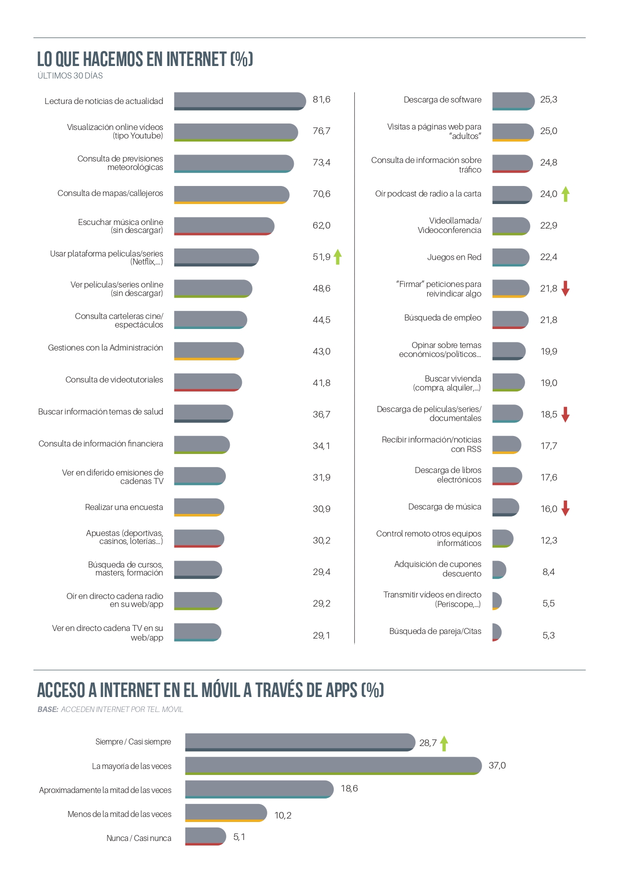 este aparato continúa siendo ver contenidos audiovisuales (79,1% en los últimos 30 días). Otro tipo de actividades realizadas son navegar por la web (24,8%), lectura de noticias de actualidad (12,8%), oír la radio (12,4%), correo electrónico (11,9%), redes sociales (11,2%) y comprar productos o servicios (6,8%).