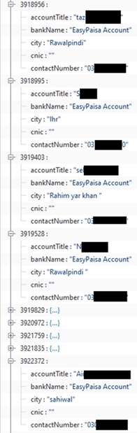 Figura 4: base de datos abierta de la aplicación de audio con datos bancarios y número de teléfono.