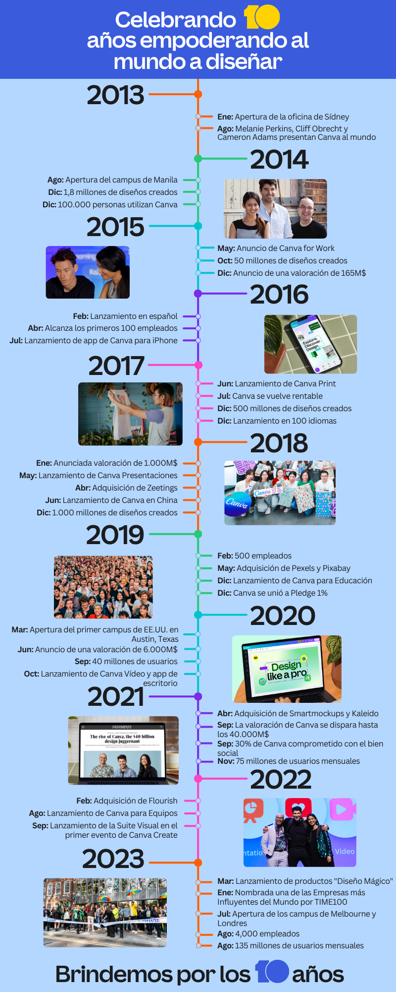 Aunque todo empezó humildemente alrededor de una mesa en Perth, Australia, ahora Canva cuenta con un equipo de más de 4.000 empleados distribuidos en ocho campus. Una década después de su creación, Canva se ha convertido en pionera de la categoría de comunicación visual, y ahora es sinónimo de diseño gráfico de forma sencilla y rápida. De hecho, más de 135 millones de personas utilizan la plataforma de Canva cada mes, y juntos han creado más de 17.000 millones de diseños.