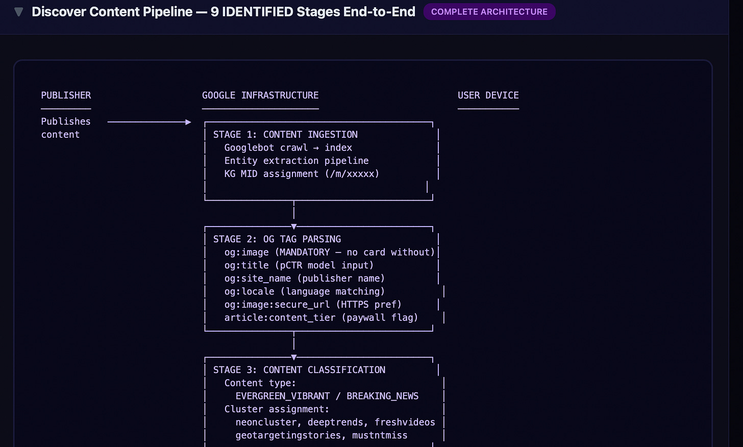 El flujo de contenido de Discover https://metehan.ai/blog/google-discover-architecture/#the-content-pipeline se puede asignar a varias etapas observables, cada una de las cuales deja rastros de telemetría distintos: