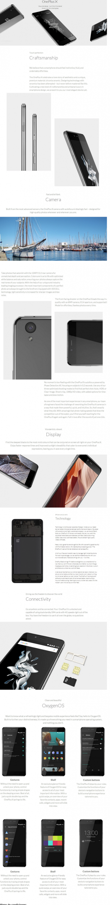 Un smartphone que sorprende a primera vista por su inmaculado diseño es minimalista. El OnePlus X se venderá en un inicio sólo a través de invitaciones. OnePlus ha optado por la utilización de nuevos materiales Premium como son el Zirconio cerámico, el aluminio o el cristal.