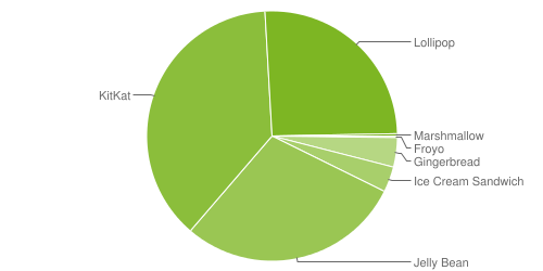 Androd Lollipop y KitKat juntos representan el 63,7 por ciento de todos los dispositivos Android. Y los datos inferiores a Android 2.2 o no figuran.