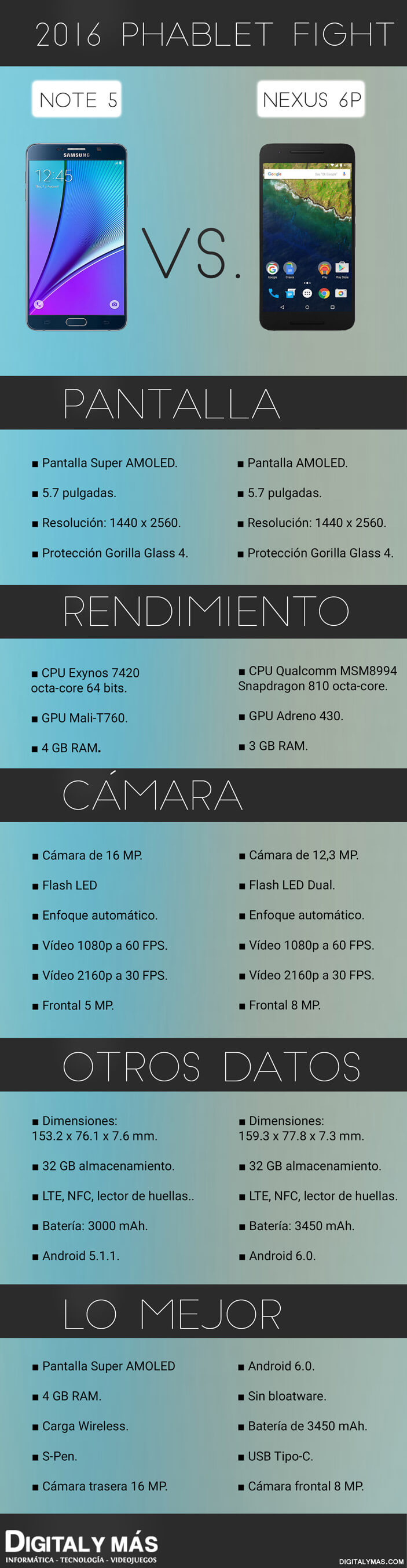 Infografía de Digital y Más. Fuente : http://digitalymas.com/2016/01/mejor-phablet-2016-note-5-vs-nexus-6p/