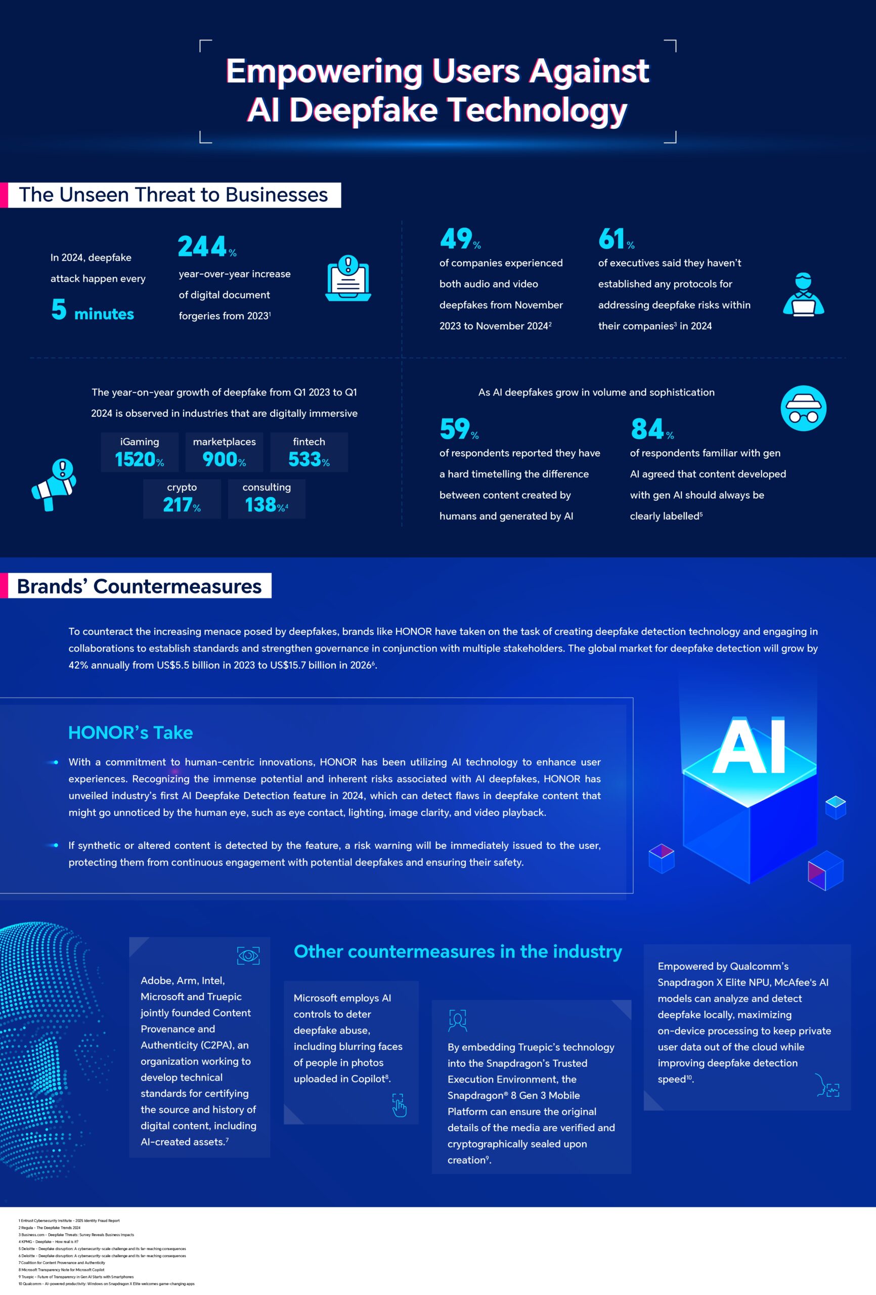 Si bien el auge de la inteligencia artificial ha traído avances increíbles, también presenta desafíos ocultos, como la proliferación de deepfakes sofisticados. Según el Instituto de Ciberseguridad Entrust, un ataque deepfake ocurre cada cinco minutos en 2024. Estas imágenes, grabaciones de audio y videos manipulados se están volviendo cada vez más difíciles de detectar, y el Estudio de Consumidores Conectados 2024 de Deloitte revela que el 59% de los encuestados tienen dificultades para diferenciar entre contenido creado por humanos y contenido generado por IA. Mientras que el 84% de aquellos familiarizados con la IA generativa creen que dicho contenido debería ser etiquetado, HONOR reconoce que las medidas de detección proactivas y la colaboración en la industria son cruciales para una protección sólida. Los líderes de la industria comparten esta opinión, con organizaciones como el Content Provenance and Authenticity (C2PA) trabajando para desarrollar estándares técnicos que certifiquen el origen y la historia del contenido digital, incluidos los activos creados por IA.