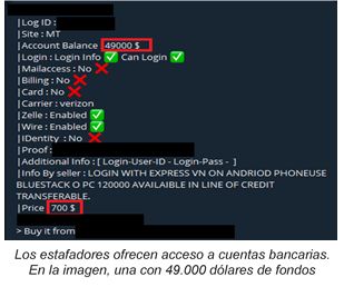 En Telegram también se ponen en venta los datos de cuentas bancarias robados mediante phishing. Hay diferentes precios. Por ejemplo, para acceder a una cuenta bancaria con un saldo de 1.400 dólares se solicita el pago de 110, y para obtener las credenciales de una cuenta con un saldo de 49.000, los ciberdelincuentes deberán pagar 700.