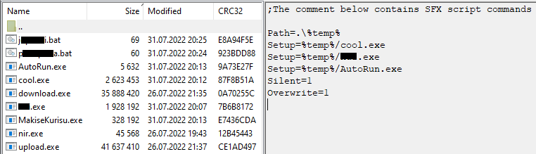 Una vez que las propias víctimas descargan el paquete original, el archivo RAR se autoextrae. Contiene una serie de archivos maliciosos, utilidades de limpieza y un script para ejecutar automáticamente el contenido desempaquetado. Algunos de los nombres de los archivos incluyen lenguaje explícito.
