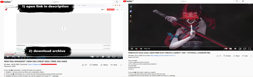 Además del propio payload RedLine, el bundle descubierto destaca por su capacidad de autopropagación. Varios archivos, en el bundle de la descripción son responsables de ello. Reciben vídeos y los publican en los canales de YouTube de los usuarios infectados junto con los enlaces a un archivo protegido por contraseña. Los vídeos anuncian trucos y cracks y proporcionan instrucciones para hackear juegos y software populares. Entre los juegos mencionados están APB Reloaded, CrossFire, DayZ, Dying Light 2, F1® 22, Farming Simulator, Farthest Frontier, FIFA 22, Final Fantasy XIV, Forza, Lego Star Wars, Osu!, Point Blank, Project Zomboid, Rust, Sniper Elite, Spider-Man, Stray, Thymesia, VRChat y Walken.