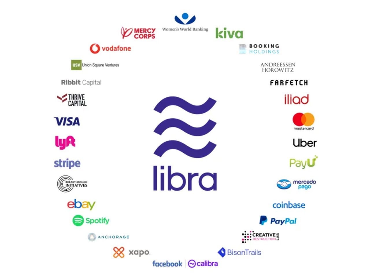 Estas empresas, que reciben el calificativo de «miembros fundadores» dentro de la asociación, incluyen, además de Facebook, a : Mastercard, Paypal, Payu, Stripe, Visa, Booking Holdings (propietaria de Booking.com, Priceline.com y Kayak.com) , eBay, Facebook/Calibra, Farfetch, Lyft, MercadoPago/MercadoLibre, Spotify, Uber, Iliad, Vodafone, Anchorage, BisonTrails, Coinbase, Xapo, Andreessen Horowitz, Breakthrough Initiatives, Ribbit Capital, Thrive Capital, USV, Creative Destruction Lab, Kiva, Mercy Corps y Women’s World Banking.
