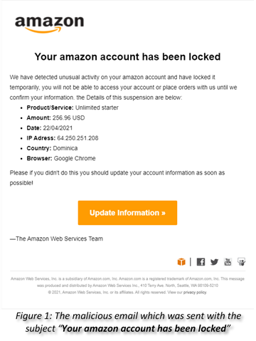 En este correo electrónico de phishing, vemos un intento de robar la información de la cuenta de Amazon de un usuario. El email (ver Figura 1) que fue enviado desde la dirección Amazon Service (Service@srv[.]androidscrib[.]com), contenía el asunto «Tu cuenta de Amazon ha sido bloqueada». El ciberdelincuente intentaba atraer a la víctima para que hiciera clic en un enlace malicioso, que redirigía al internauta a una página fraudulenta que parecía el sitio web real de inicio de sesión de Amazon . En el enlace malicioso (https://habitosdamente[.]com[.]br/wp-admin/includes/logs/update-your-account-information/security-measure/?iyh_re), el usuario debía introducir su nombre de usuario y su contraseña.