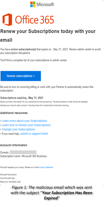 Durante el segundo trimestre de 2021, se ha identificado un correo de phishing malicioso que intentaba robar las credenciales de una cuenta de Microsoft. El email (véase la figura 1) que se envió desde la dirección de correo falsa de Microsoft (no-reply@microsoft[.]com), contenía el asunto «Your Subscription Has been Expired». El atacante intentaba atraer a la víctima para que hiciera clic en un enlace malicioso (http://adminsys[.]serveftp[.]com/nensa/fabio/ex/478632215/zer7855/nuns566623) que redirigía al usuario a una página fraudulenta de inicio de sesión de Microsoft en el que el usuario debía introducir los datos de su cuenta de Microsoft.