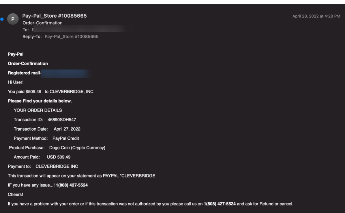 En esta amenaza envían lo que parece una confirmación de pedido de PayPal. En ella se indica al usuario que ha comprado más de 500 dólares en DogeCoin. Para cancelar el pedido, pueden llamar a un número de atención al cliente.