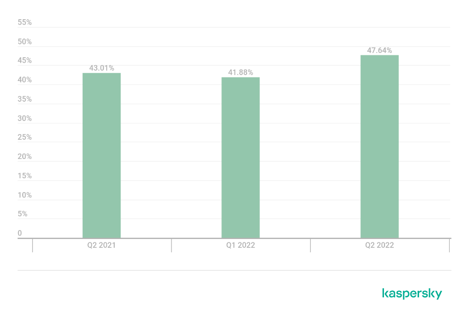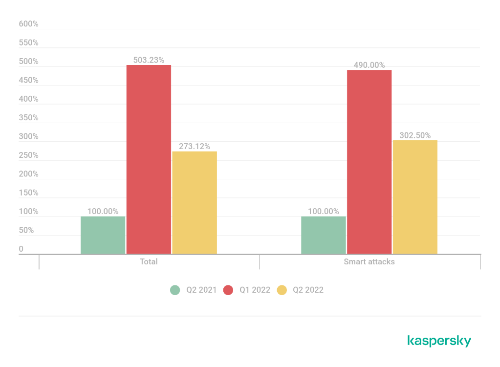 Uno de cada dos ataques detectados por Kaspersky en el segundo trimestre de 2022 fue inteligente, lo que significa que sus organizadores llevaron a cabo una preparación bastante sofisticada. El porcentaje de ataques inteligentes alcanzó casi el 50% en este periodo, lo que supuso casi un nuevo récord. La cuota más alta de todos los tiempos se estableció hace cuatro años, cuando el mercado de los DDoS estaba de capa caída, y no es de extrañar que se observen cifras tan altas durante un año «caliente» en términos de actividad de DDoS.