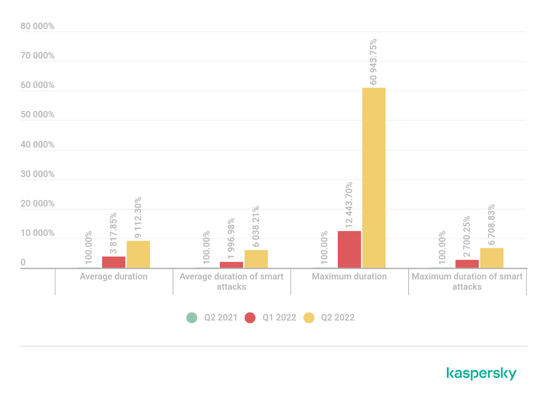 La duración media de un ataque en el segundo trimestre de 2022 fue de 3.000 minutos, es decir, dos días. Es 100 veces más largo que en el mismo periodo del 2021, cuando un ataque duraba solo 30 minutos de media. En comparación con el primer trimestre de 2022, que se caracterizó por una duración sin precedentes de las sesiones de DDoS como resultado de la actividad de los hacktivistas, la cifra se triplicó.